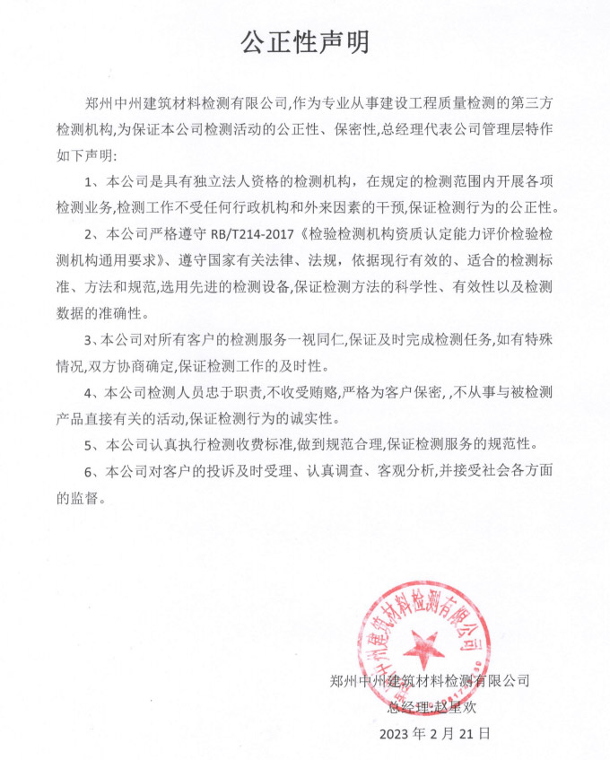 通過河南省質(zhì)量技術監(jiān)督局計量認證、河南省住房和城鄉(xiāng)建設廳批準,具有獨立法人資格的第三方檢測機構。